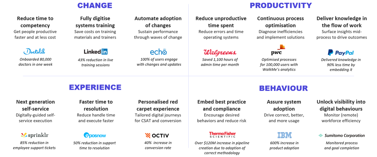 Forbes 2020 findings included a 60% reduction in training time and 50% savings in IT and Help Desk tickets. For reasons such as this, many clients will purchase WalkMe from their budget for Business Readiness / Organisational Change Management.